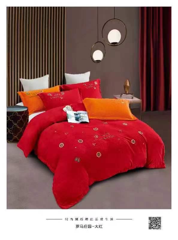 源怡牛奶绒保暖刺绣四件套罗马庄园-大红